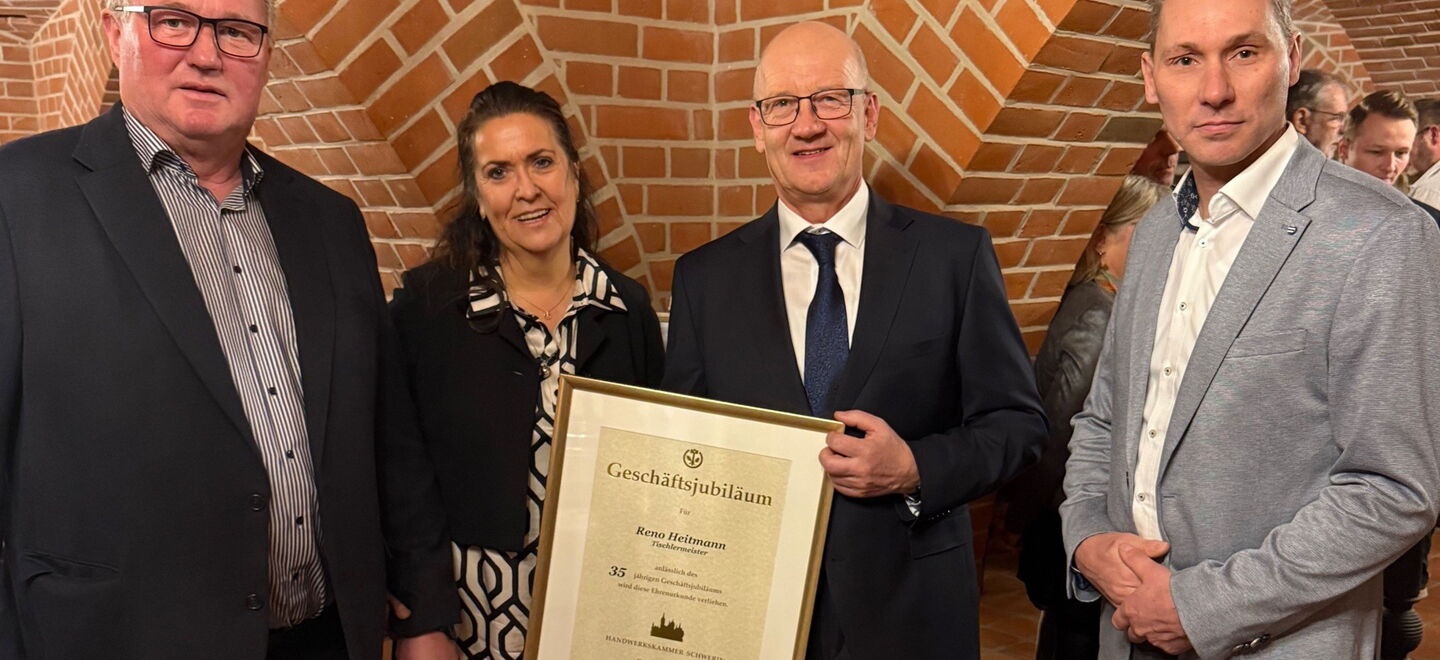 Im Namen der Tischler-Innung Hagenow/Ludwigslust überreichten Obermeister Andy Mrowiec und Vorstandsmitglied Matthias Au die Urkunde zum Geschäftsjubiläum. Obermeister Andy Mrowiec würdigte Reno Heitmann als Unternehmer und engagiertes Innungsmitglied: „Reno Heitmann steht seit Jahrzehnten für handwerkliche Qualität, Verlässlichkeit und unternehmerische Beständigkeit. Besonders hervorzuheben ist zudem sein langjähriges ehrenamtliches Engagement für unsere Innung.“ Herr Heitmann ist seit der Firmengründung im Jahr 1991 Mitglied der Innung. Von 2005 an engagierte er sich über 14 Jahre hinweg im Vorstand. Seit 2019 ist er stellvertretender Obermeister der Tischler-Innung Hagenow/Ludwigslust.